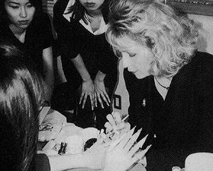 日本のネイル市場とネイリストについては、「ネイル人口が年々増え続け、サロンもスクールもさくさん出来たことは、ネイルに携わる者として大変嬉しいことです。これが一時のブームにとどまらず、本物の広がりをもって、定着することを期待しています。」「東洋人はとても器用です。中でも日本人の方は大変熱心で、一つ一つの作業がとても丁寧なのに感心させられます。世界一の繊細な技術力と感性を兼ね備えていると確信しております。しかし、サロンにおいては、多くのお客様の要望に応えなければなりません。常にタイム(技術時間)を考慮した技術力が要求されるのです。いかに短い時間で、お客様の要望を満たした美しい爪に仕上げることが出来るかが、基本になります。」とのこと。 |